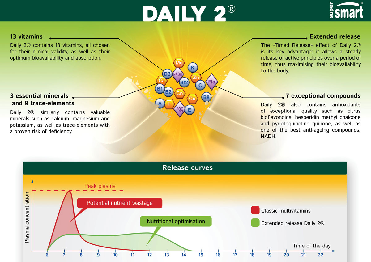 The key advantage of Daily 2® is its ‘Timed Release’: a galenic form which enables the supplement’s active principles to be continually released over time.