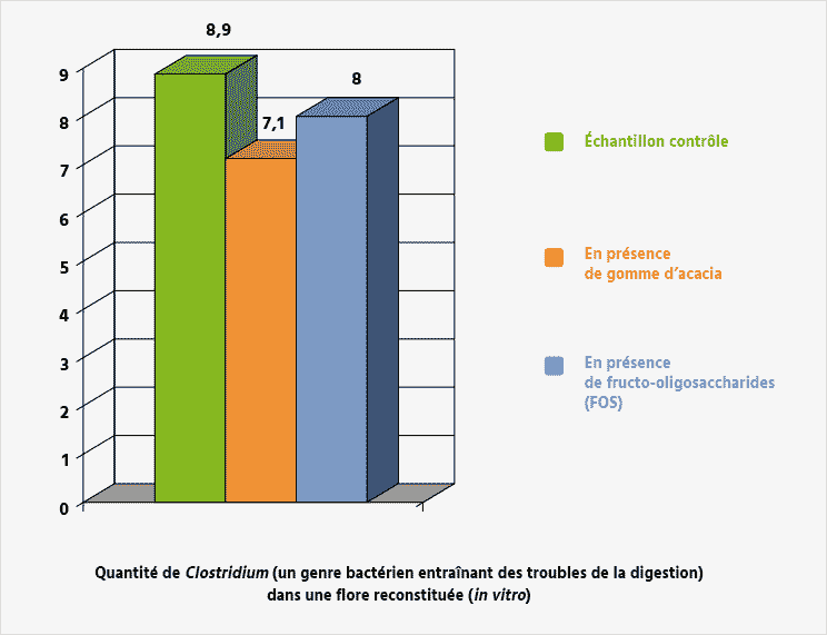 Des études in vitro ont montré que, parmi les différents genres de bactéries qui colonisent le côlon (bénéfiques ou pathogènes), ce sont les souches du genre Bifidobacterium qui sont le plus capables d’utiliser la gomme d’acacia pour leur croissance (4). Il s’agit d’un genre impliqué dans la prévention de plusieurs maladies et le maintien de la santé générale.