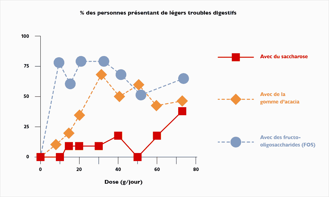 L’effet semble significatif aux alentours de 10 à 15 g/jour (36). Une étude randomisée en double aveugle, impliquant 96 volontaires, a montré qu’une dose inférieure à 6 g/jour induisait une augmentation tout juste significative de bifidobactéries par rapport à un groupe contrôle. En revanche, il est certain que de hautes doses peuvent provoquer des effets secondaires tels que des diarrhées ou des inconforts digestifs (37).